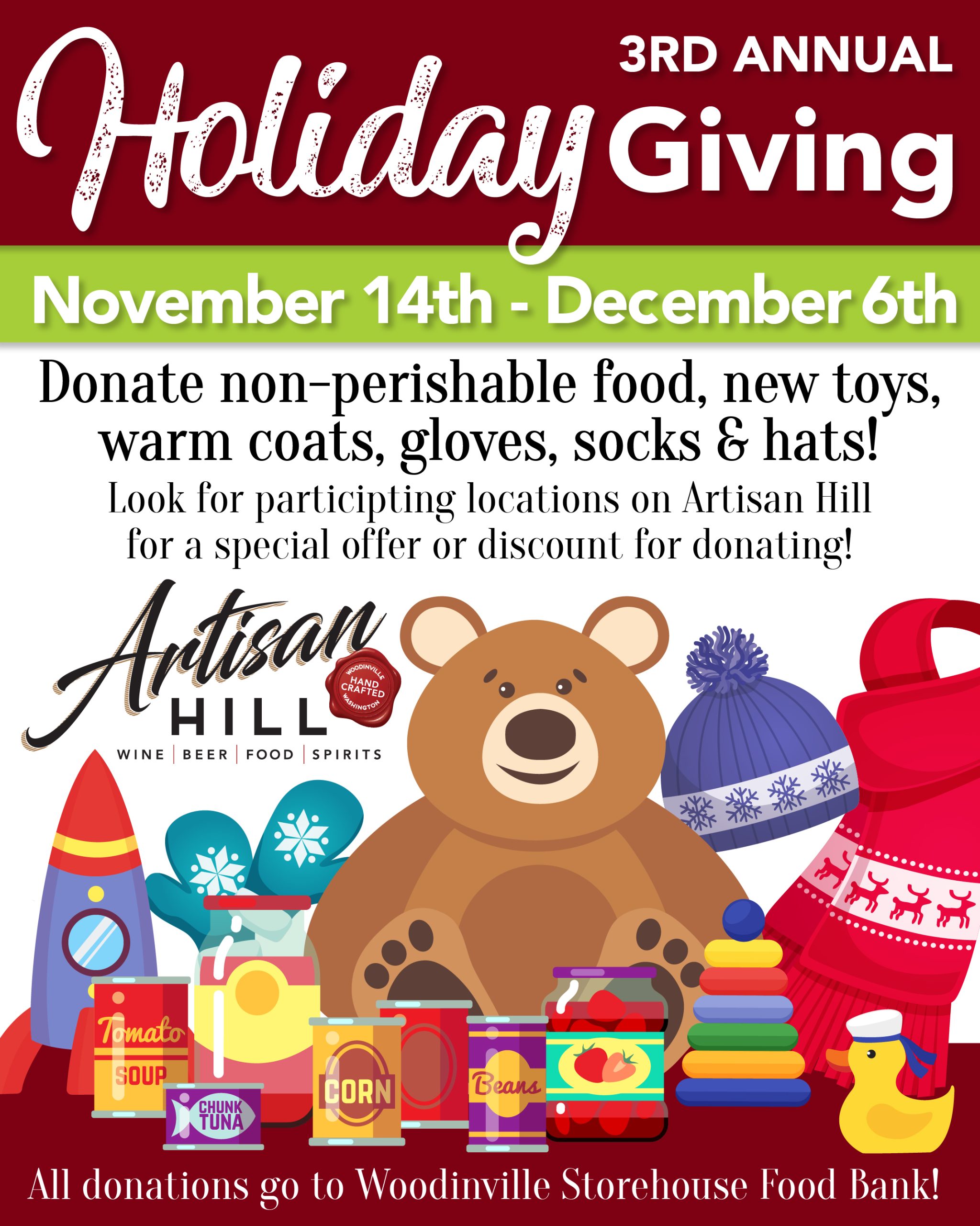 This holiday season, the businesses of Artisan Hill are coming together once again to support our neighbors in need. Bring your donations of toys and nonperishable food items, along with new or gently used warm coats, hats, gloves, and scarves, to participating locations throughout the district.