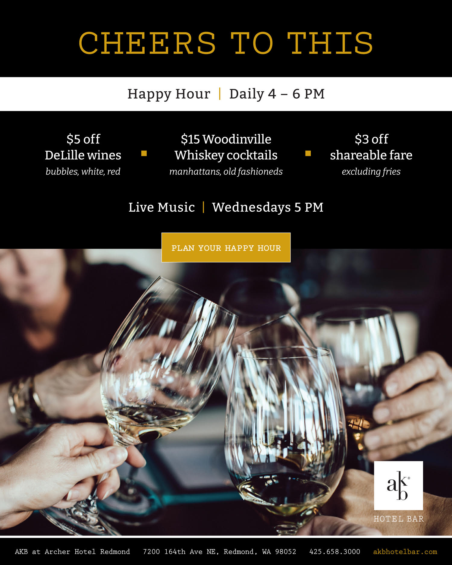 Join us for Happy Hour at AKB, the bar inside Archer Hotel Redmond, every day from 4β6 PM. Enjoy $5 off DeLille wines, $15 Woodinville Whiskey cocktails, and $3 off shareable fare (excluding fries). Kick back with live music every Wednesday at 5 PM. It’s the perfect way to unwind midweek or start your evening right.