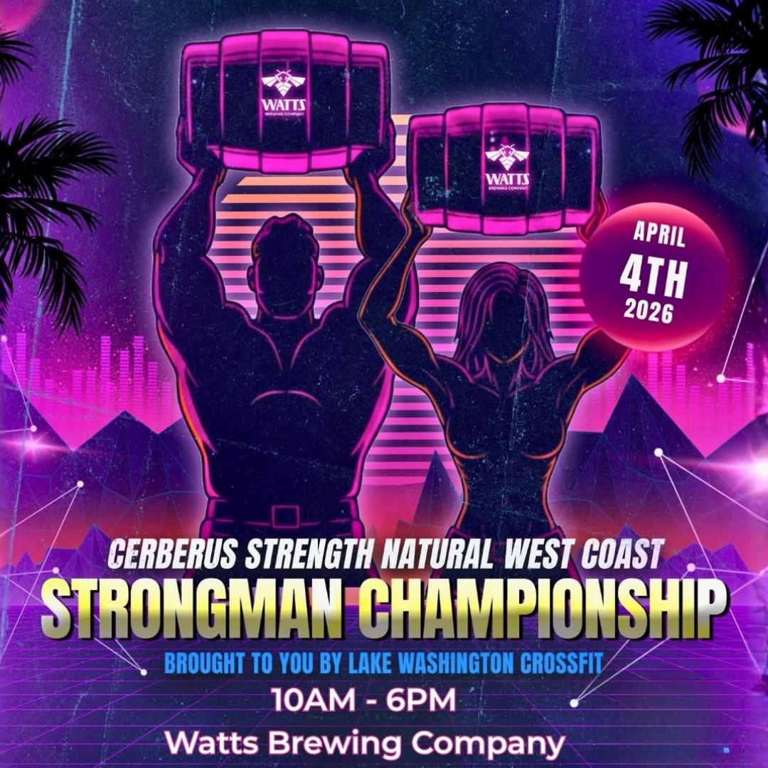 The Natural Strongman West Coast Championship is coming to Woodinville! On Saturday 4/4, you have a chance to see these amazing athletes compete at challenges like deadlifts, log clean and press, and keg carries in front of the Watts Brewing tanks. The winners earn entry to the world championships in Glasgow, Scotland, so expect to see some of the strongest athletes in the world!