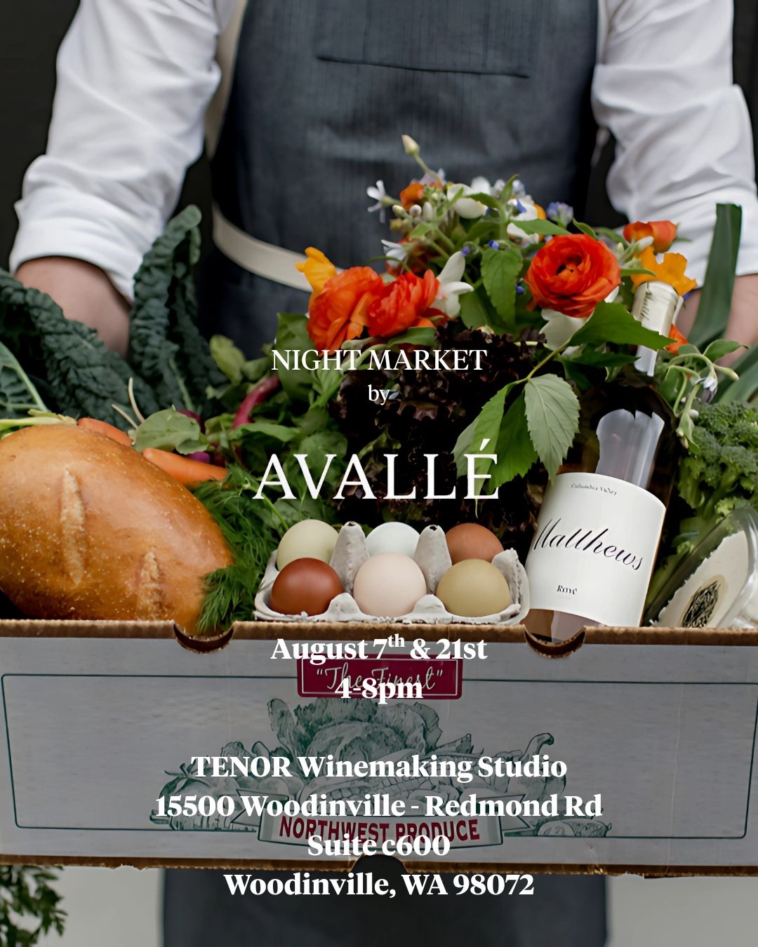 Join us for Avallé Night Farmers Market! Hosted at our Winemaking Studio off of Redmond-Woodinville Rd, it will be an event full of food, local goods, and live music.