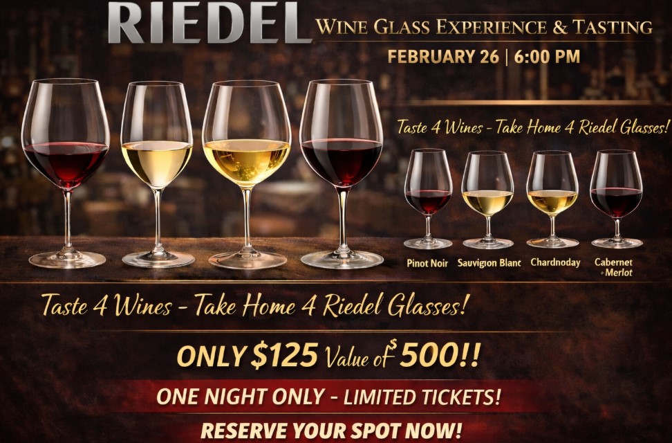 Join us for a one-night-only Riedel Wine Glass Experience, a fun and educational tasting led by an official Riedel representative. You’ll taste four exceptional wines side-by-side while learning how glass shape affects aroma, flavor, and balance—proving that the glass truly matters.