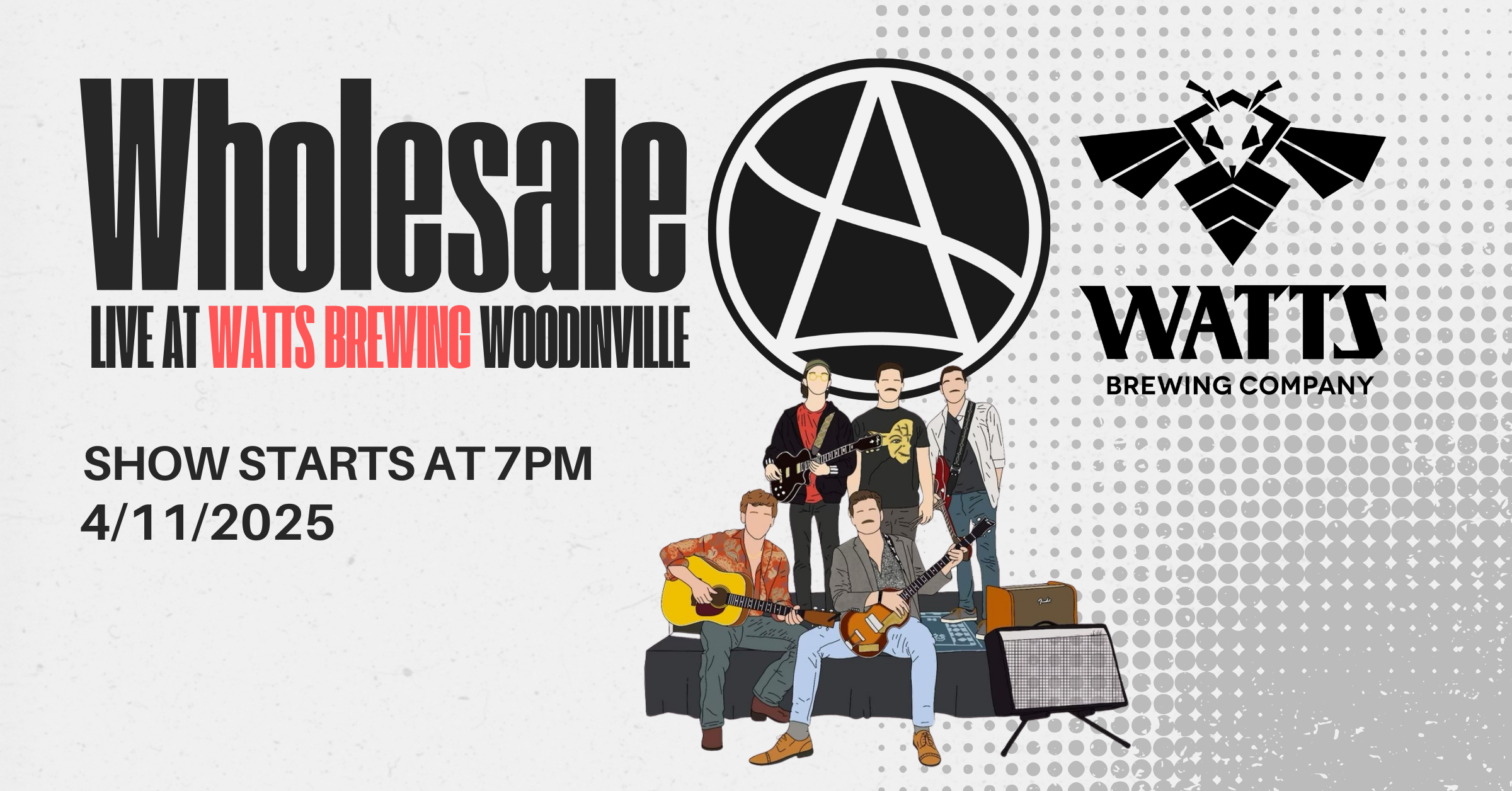 Join us on Friday 4/11 at 7 pm for the return of Wholesale at Watts Brewing! Five guys, guitars, keyboards, drums, and a whole lotta heart, Wholesale rolls up to the intersection of alt and rock with the top down and shades on, ready to get something started.