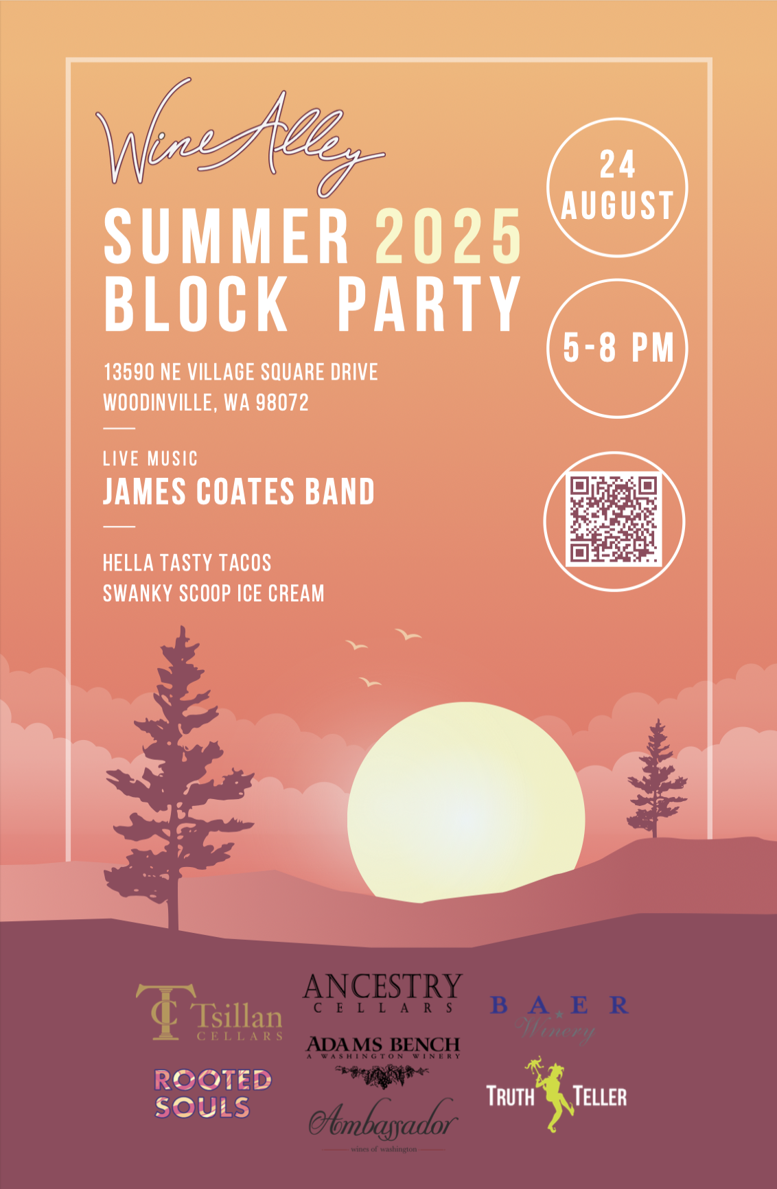 Woodinville’s premier wine tasting locale is closing out the Summer with our Wine Alley Summer Block Party on Sunday, August 24th from 5-8 PM. Featuring delicious wines from all seven alley wineries and live music. Space is limited and this is definitely one you won’t want to miss, so grab your tickets and invite your friends!