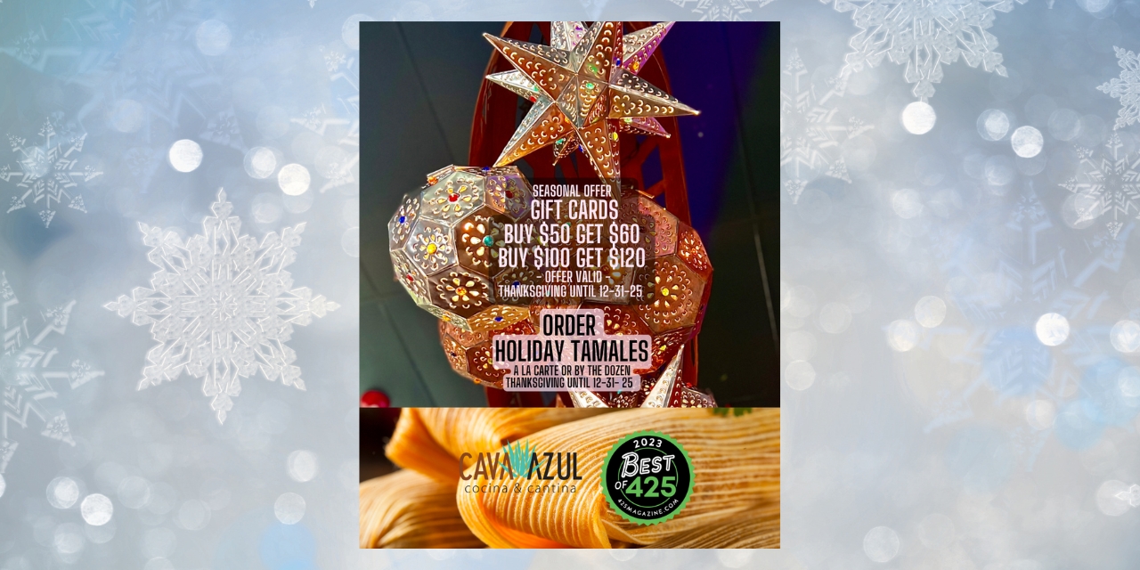 Enjoy seasonal tamales for dine-in or takeout, along with a holiday gift card bonus available from Thanksgiving through December 31, 2025. Buy a $50 card and receive $60, or buy a $100 card and receive $120.