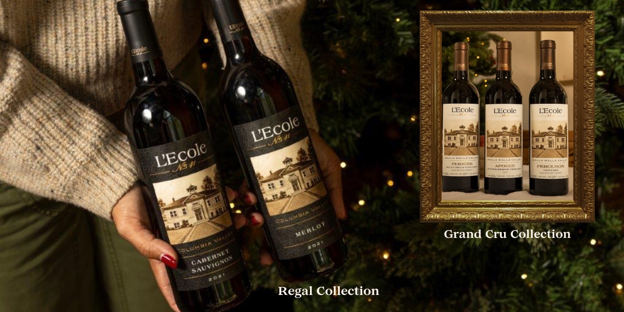 L’Ecole № 41 offers two beautifully packaged gift sets perfect for the season. The Regal Collection pairs a Walla Walla Valley Cabernet Sauvignon with a Columbia Valley Chardonnay for a classic red-and-white duo. The Grand Cru Collection is crafted for collectors, featuring their top estate wines from Ferguson, Seven Hills, and Pepper Bridge vineyards. Each set arrives in a branded gift box with a personalized message and ground shipping included.