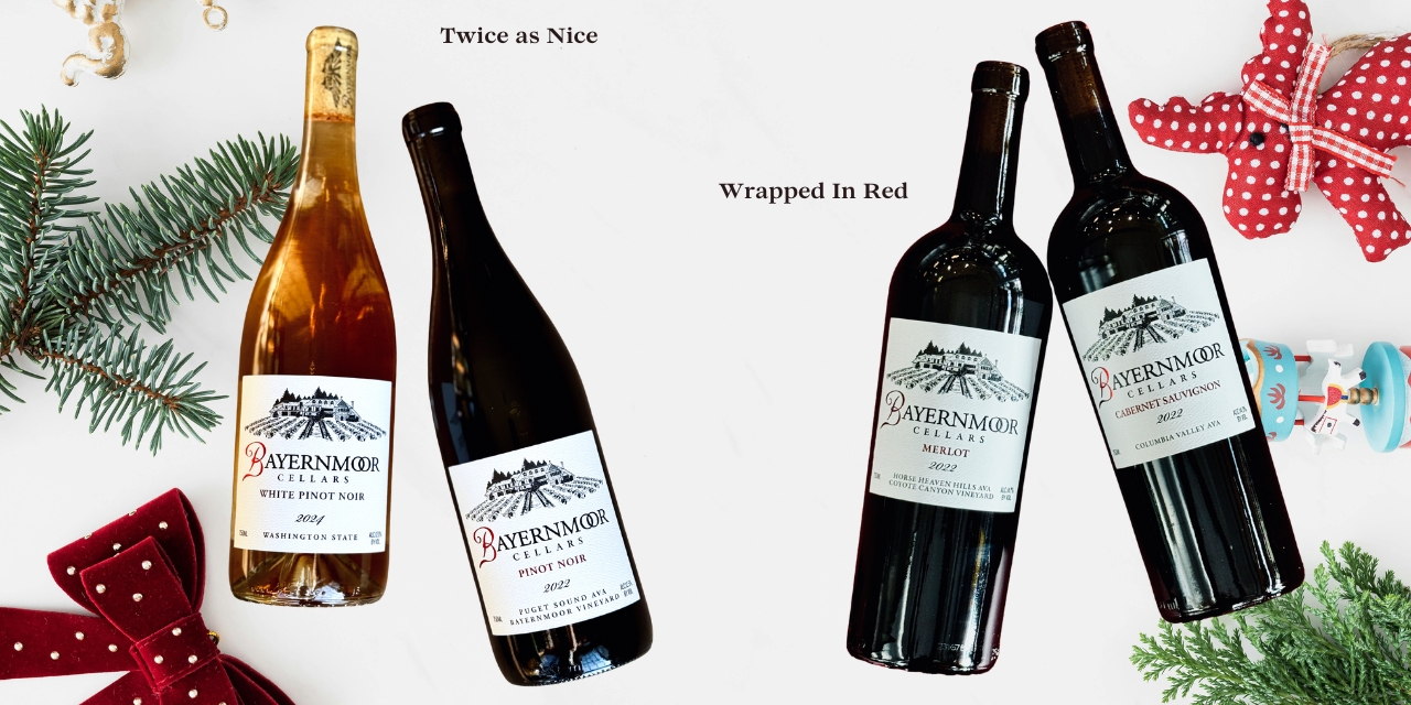 Celebrate the season with two award winning pairings. Twice as Nice brings together the 2024 White Pinot Noir (96 points) and 2022 Estate Pinot Noir (Platinum Award), a versatile duo that complements holiday dishes from start to finish. Wrapped in Red features the 2022 Merlot (93 points) and 2022 Cabernet Sauvignon Columbia Valley (90 points), a rich red pairing perfect for festive tables or gifting.